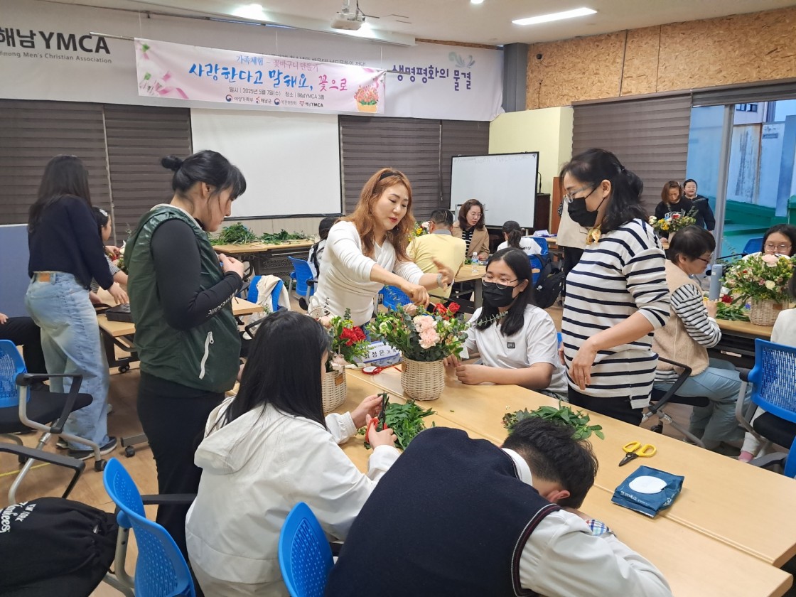 부모님과 자녀가 함께 준비된 바구니에 꽃을 꽂아 풍성한 꽃바구니를 만드는 시간을 가졌습니다.