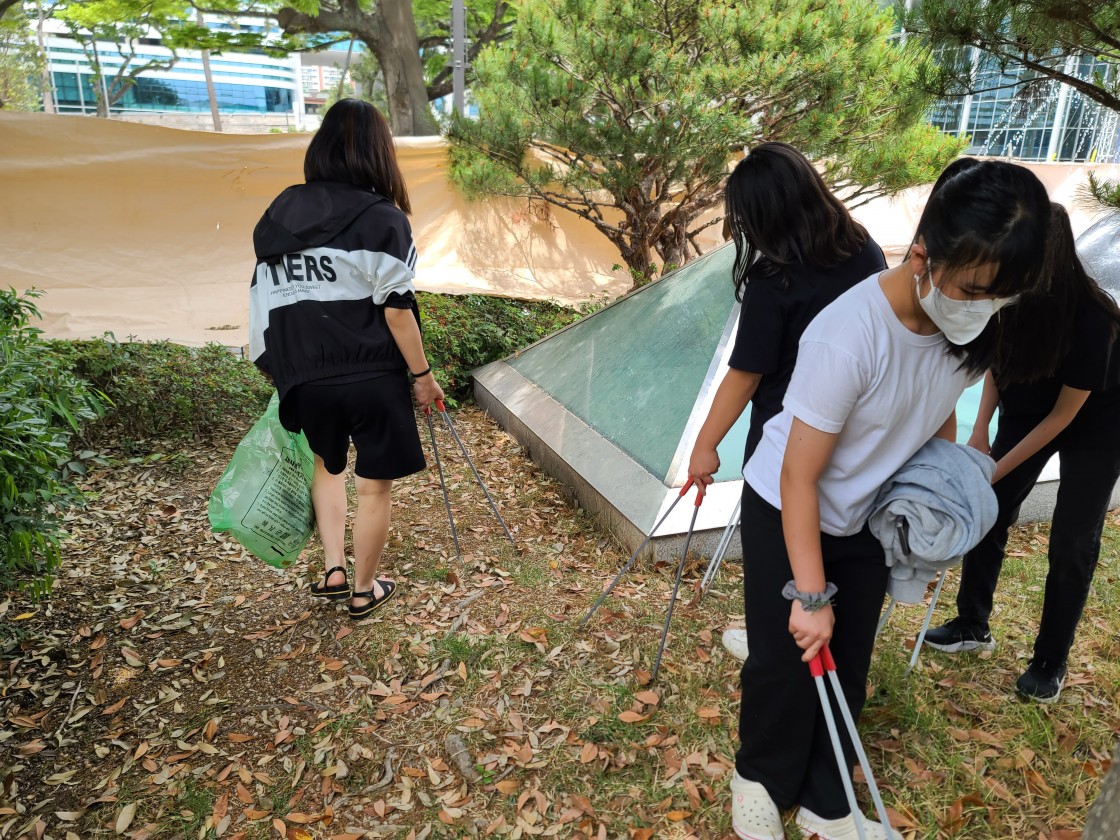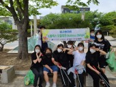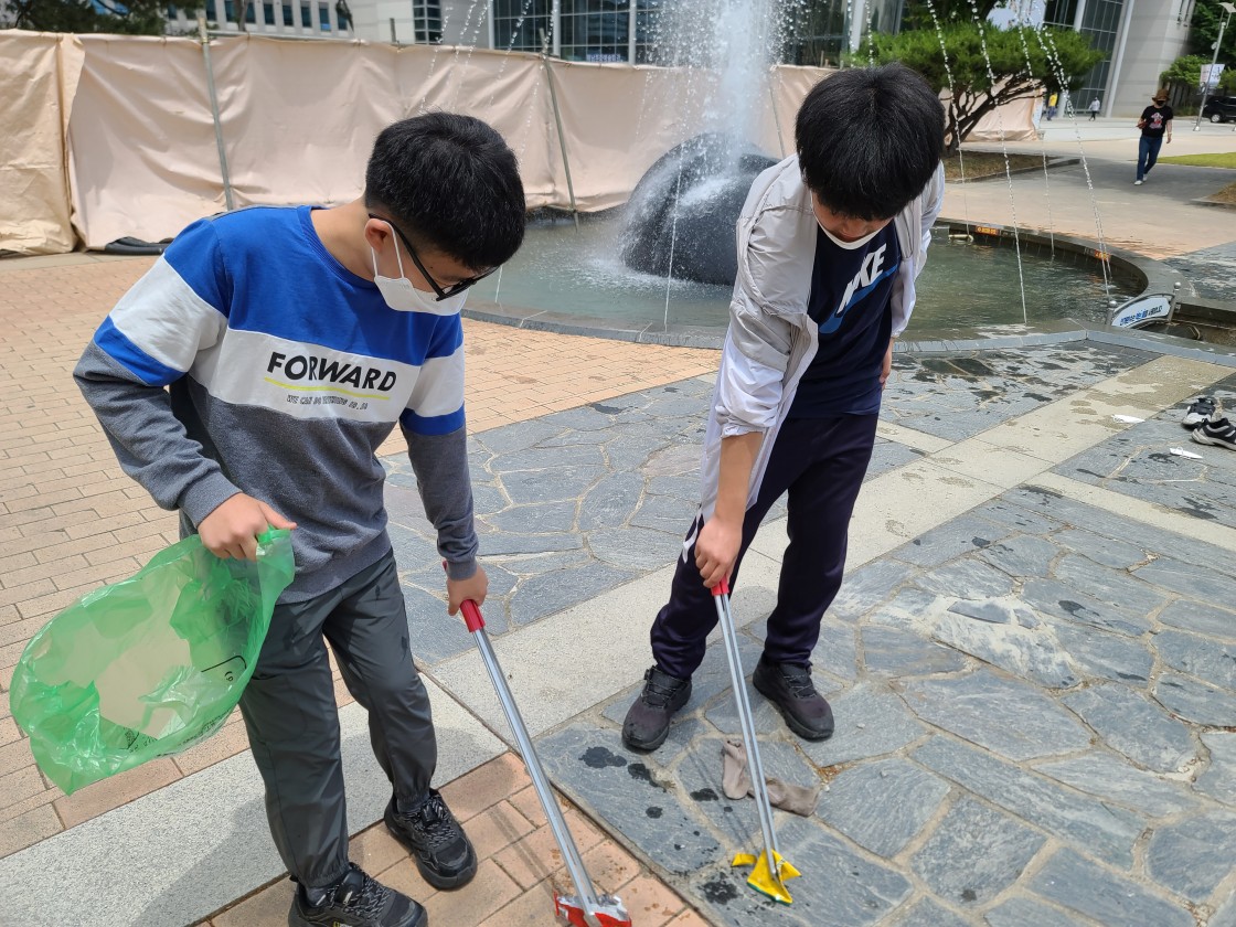 봉사 동아리는 무더운 날씨에 군민광장 주변에 버려진 쓰레기를 주워 담으며