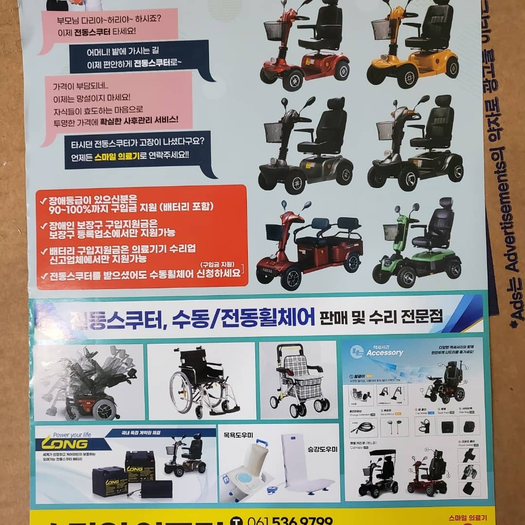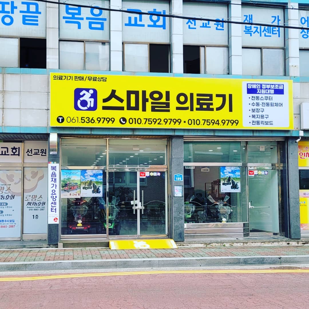 스마일의료기는 어르신들이나 몸이 불편하신 분들이 사용할 수 있는 전동스쿠터, 수동/전동 휠체어, 실버카 같은 보장구들을 판매하는 곳입니다.