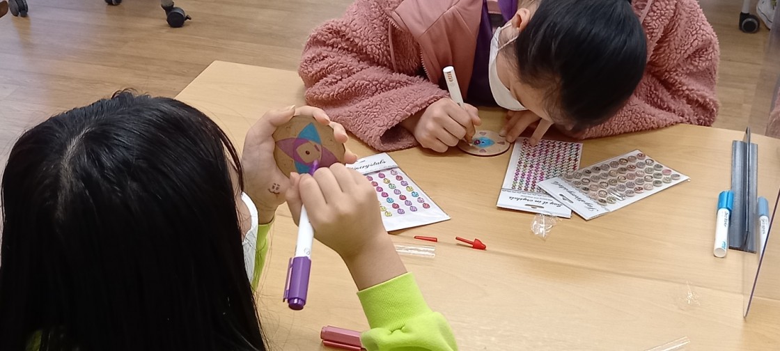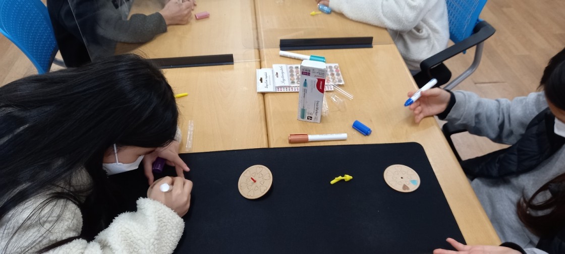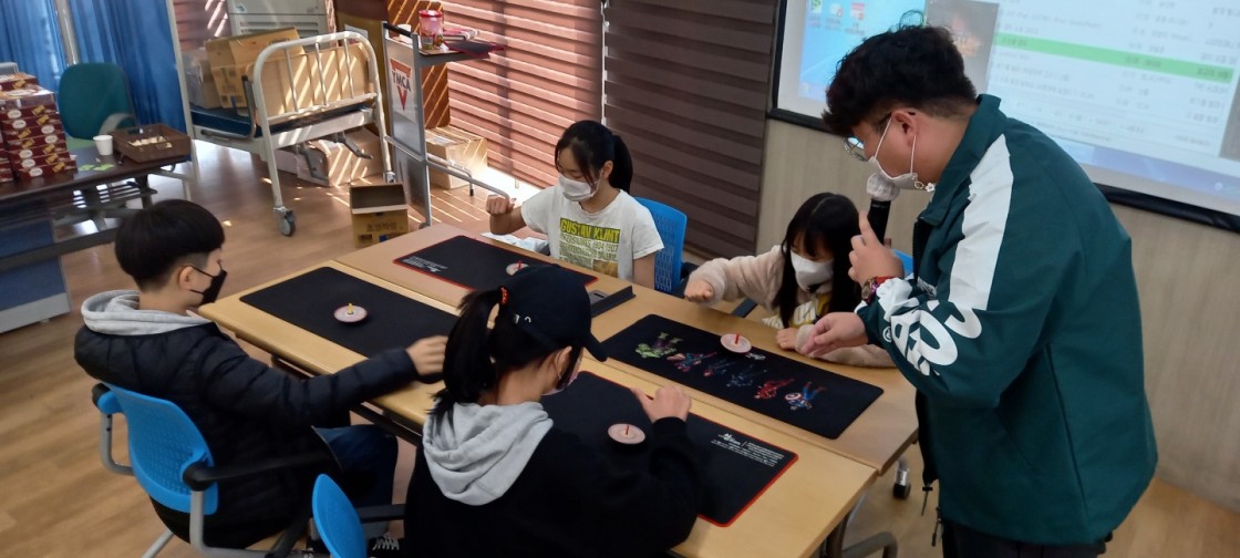 2021년 3월 13일 코로나 방역수칙을 지키며 색팽이를 만들고 팽이 대회를 개최해보았습니다.