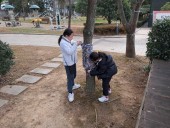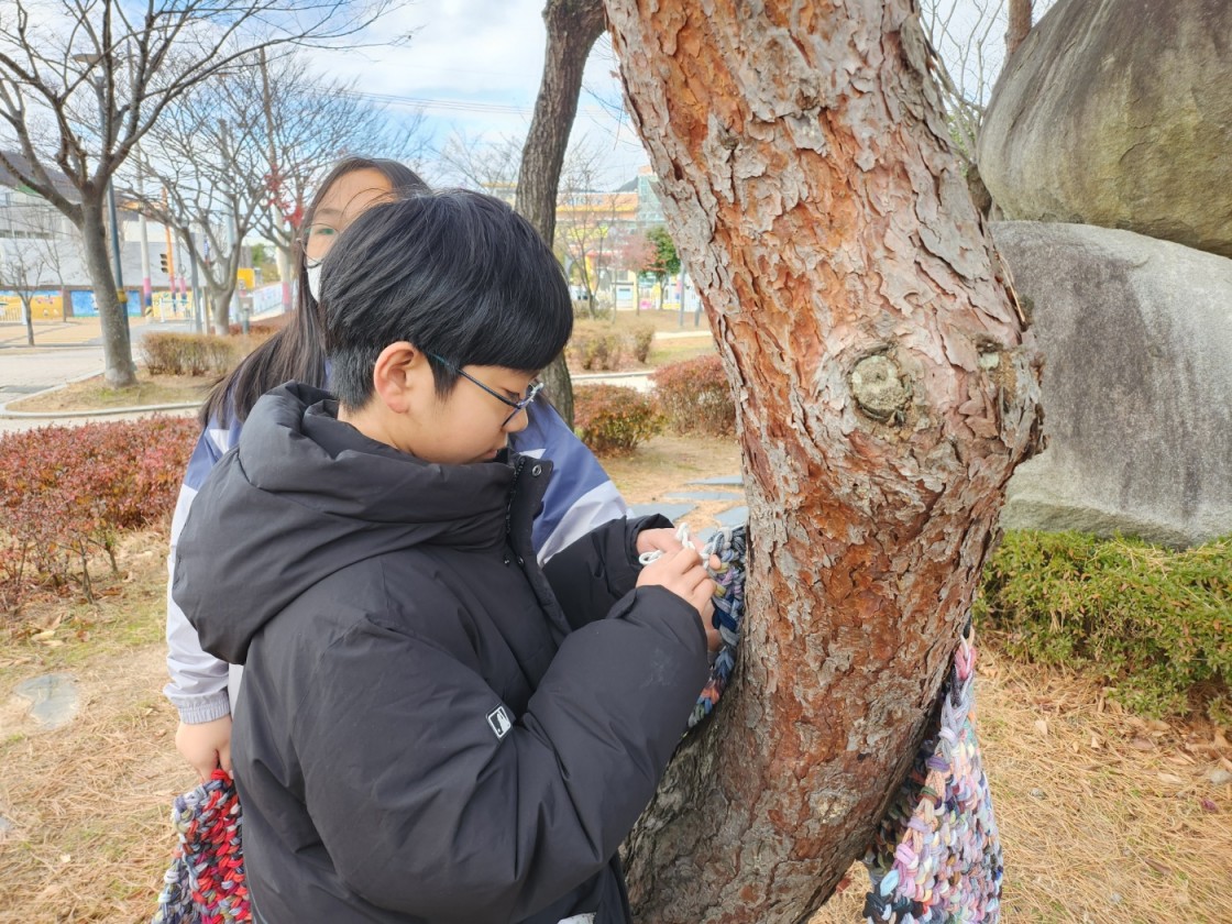 추운 날씨지만 참여 청소년들이 직접 만든 양말목 옷을 나무에 입혀 자연환경을 보호하는 활동을 진행하였습니다.